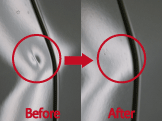 近年になってアメリカから上陸した最新の自動車特殊板金技術をデントリペア と言います。 デントリペアとは、車に出来た小さな凹みを復元する画期的修復法です。 正 式名称をペイントレス・デントリペアと言い、その名の通り従来の板金や再塗 装をすることなく数十分程度で修復してしまう技術を呼びます。 凹みを裏側から専用特殊工具で丁寧に押し戻すことにより、歪みまでコンロトールしとても早く綺麗に直せるのが特徴です。塗装しないで修復することにより、とても早く綺麗に、そしてお安くご提供することが出来ます。